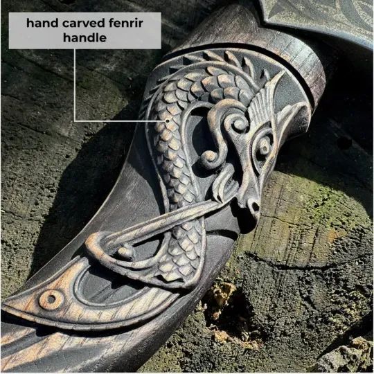 Vikinška kultura: Uronite u baštinu vikinškog oružja s ručno kovanom sjekirom koja odaje počast legendarnom Fenriru s pomno ručno izrezbarenom drškom koja detaljno prikazuje njegovu moć.